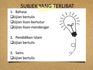 Pentaksiran ini dinyatakan dalam Dokumen Standard Kurikulum dan Pentaksiran DSKP setiap mata pelajaran.